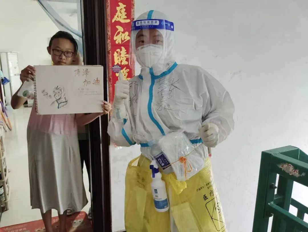 記得在7月30日傍晚7:57分接到去菏澤支援的通知的那一刻,我忍不住偷偷暗喜,想著終于逃離媽媽的“魔”掌,可以肆無忌憚地享受一段無人約束的日子了。于是匆匆收拾好行李,直奔醫(yī)院集合,跟戰(zhàn)友們踏上了抗疫的征程。當(dāng)晚11點(diǎn)左右我們到達(dá)菏澤,日常需要事事報(bào)備的我躺在床上給家里發(fā)完平安短信,便開始期待并規(guī)劃明天的戰(zhàn)斗。第二天我們?nèi)?duì)斗志昂揚(yáng)地進(jìn)入小區(qū)后發(fā)現(xiàn),這里是高風(fēng)險(xiǎn)小區(qū),而且是步梯式多層小區(qū),我們只能爬樓梯挨家挨戶排查采樣,每組每天大約排查100多層二三百家住戶。